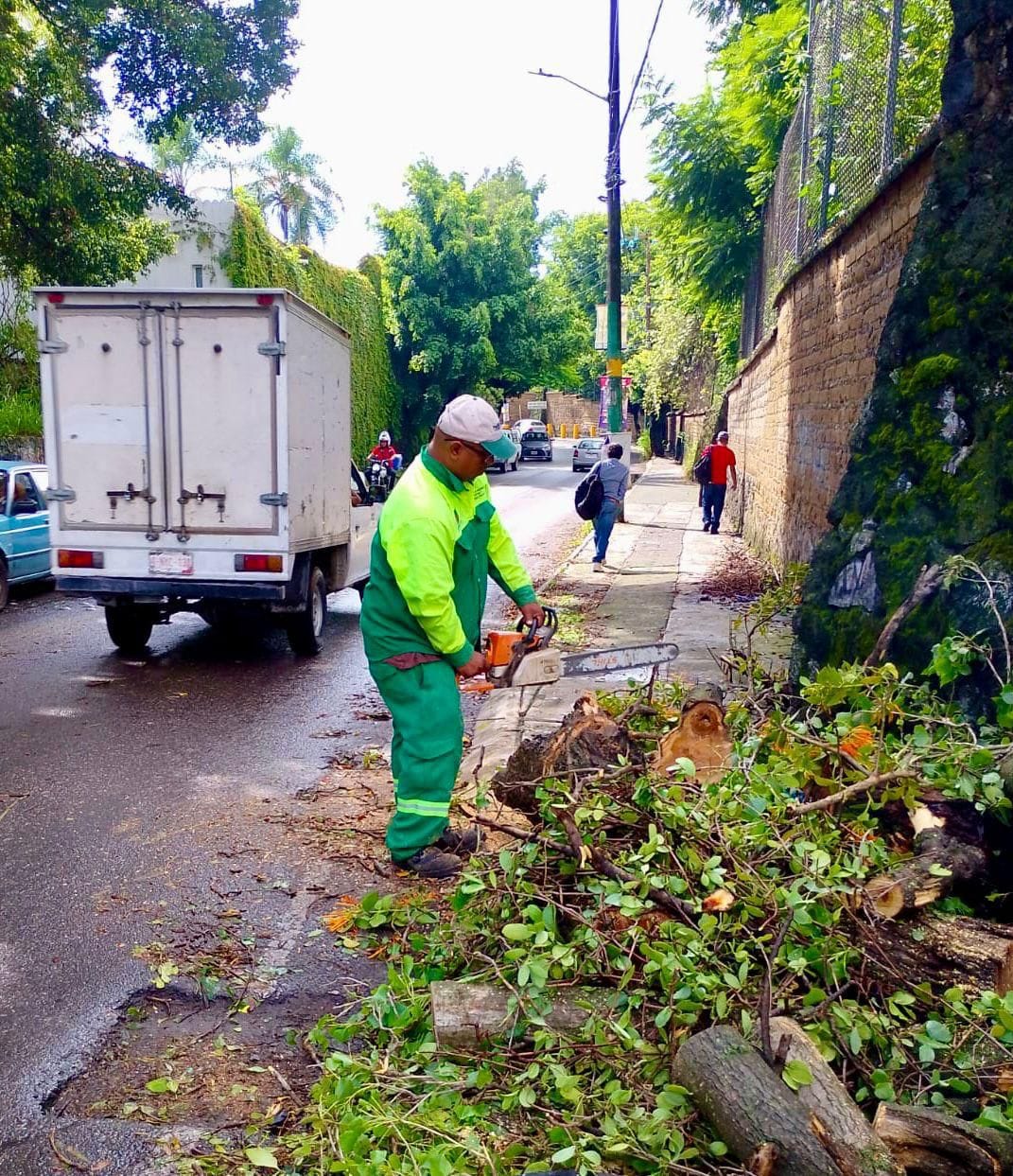 Tras las intensas lluvias registradas en Cuernavaca, el Ayuntamiento, a través de la Secretaría de Desarrollo Sustentable y Servicios Públicos (SDSySP) y en coordinación con el Cuerpo de Bomberos, atendió de manera inmediata la contingencia provocada por un árbol colapsado en la esquina de Subida a Chalma y Camino a la Mina, en la colonia Lomas de Atzingo.