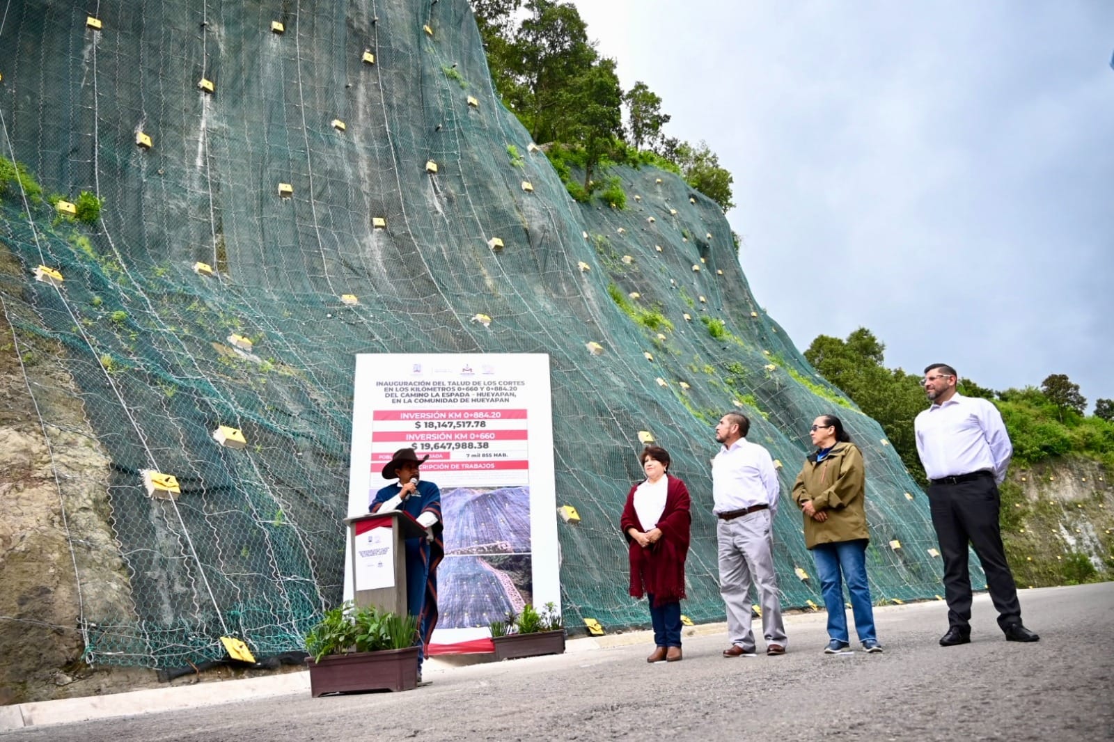 En el primer acto, se inauguró la segunda etapa de los trabajos emergentes para la protección y estabilización de taludes en el camino La Espada – Hueyapan, específicamente en los kilómetros 0+660 y 0+884.20, en el barrio San Bartolo. Esta obra responde a las necesidades de seguridad vial en una zona que ha enfrentado problemas de derrumbes y deslaves, especialmente durante la temporada de lluvias. La inversión fue de aproximadamente 37.8 millones de pesos, y se espera que mejore la conectividad entre Hueyapan y Tetela del Volcán, garantizando así la seguridad de los automovilistas.