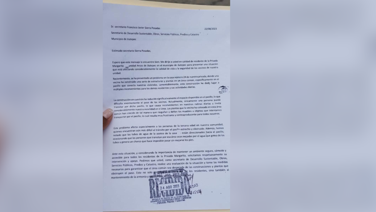 En agosto del 2023 le dirigieron un escrito al Secretario de Desarrollo Sustentable del municipio de Jiutepec, Francisco Javier Sierra, para que acuda a resolver la situación, pero hasta la fecha no hay respuesta.