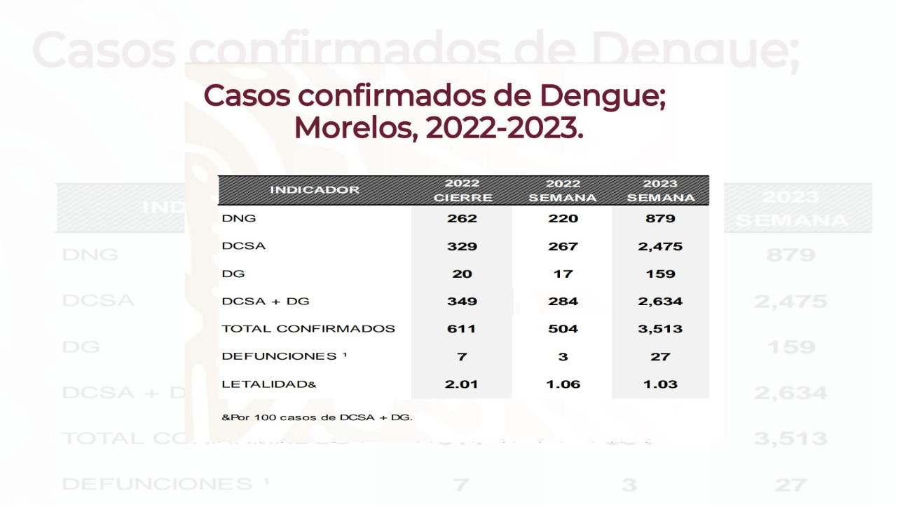 El número de casos confirmados es de 3 mil 513, el menor número son los casos se dengue hemorrágico con 159 casos, 879 casos son de dengue no grave y la mayor cantidad de casos de dengue son clasificados como de signos de alarma en donde hay 2 mil 475 casos.