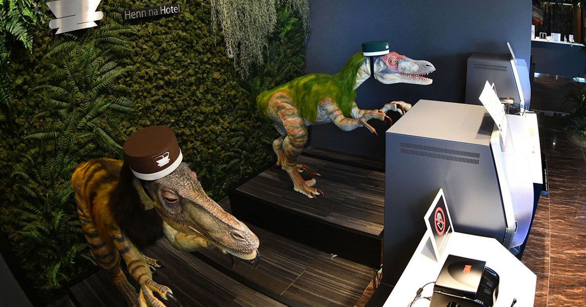 El hotel Henn na en Tokio se ha vuelto famoso por ser atendido por robots dinosaurios desde la recepción e invitan a los huéspedes a registrarse en una pantalla táctil que se activa gracias a los sensores de movimiento en el diseño de los dinosaurios.