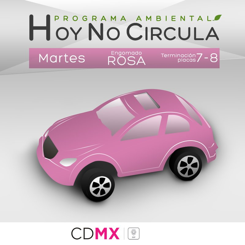 Si viajas hoy a la Ciudad de México, no olvides que no circula en la zona metropolitana del Valle de México, engomado rosa con terminación de placas 7 – 8, holograma 1 y 2.