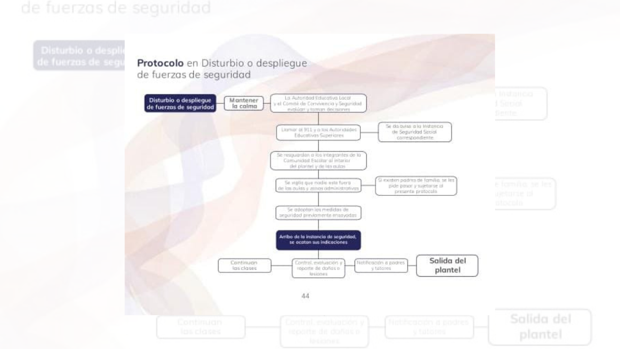 El Manual y Protocolos para la Seguridad y la Convivencia Escolar, en su página 44, refiere que en caso de un disturbio o despliegue de fuerzas de seguridad se debe mantener la calma.