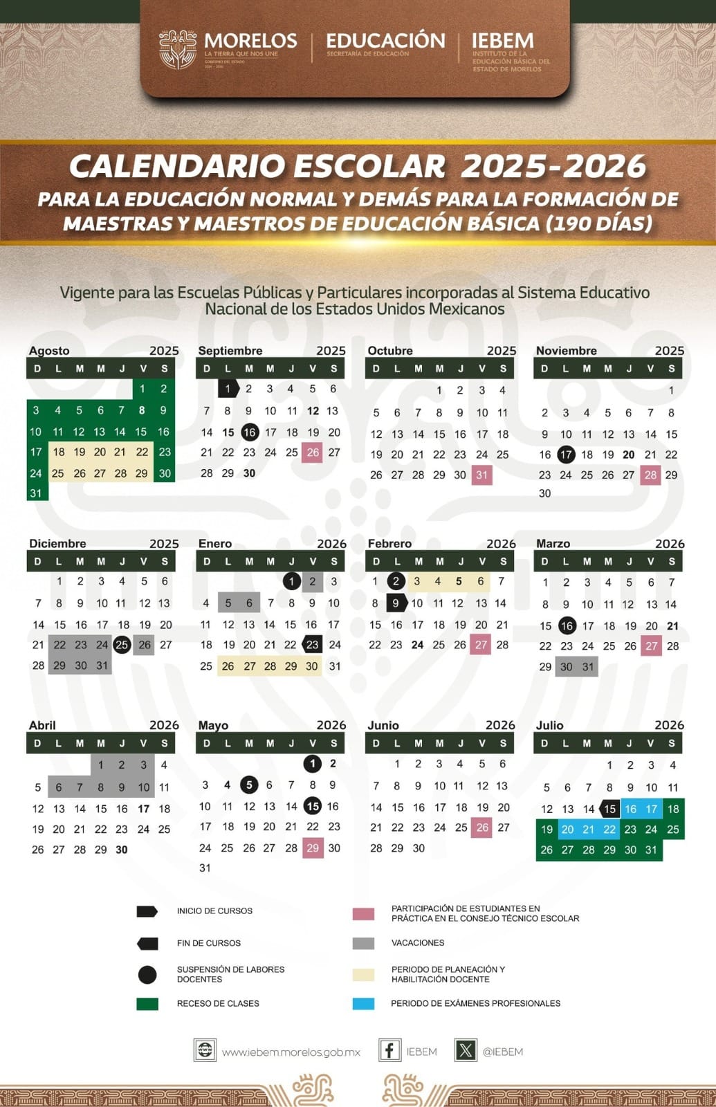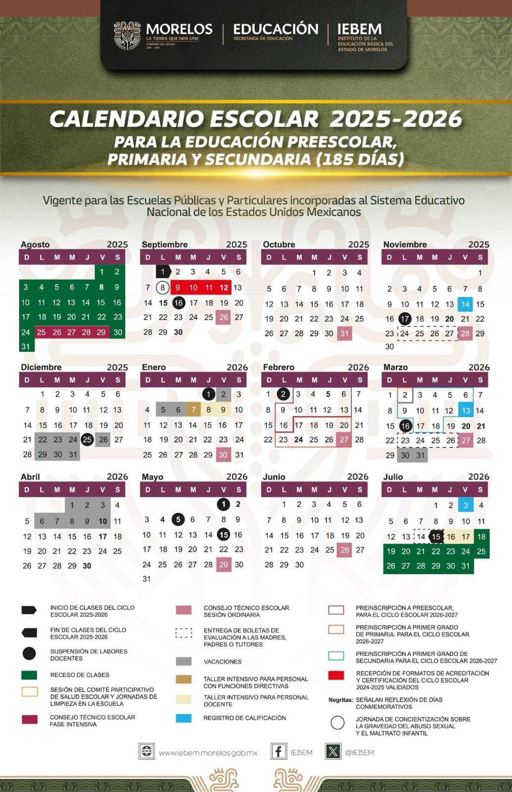 El Instituto de la Educación Básica del Estado de Morelos (IEBEM) presentó el Calendario Escolar 2025-2026, que contempla 185 días de clases para Preescolar, Primaria y Secundaria, así como 190 días de actividades para Educación Normal y formación docente.