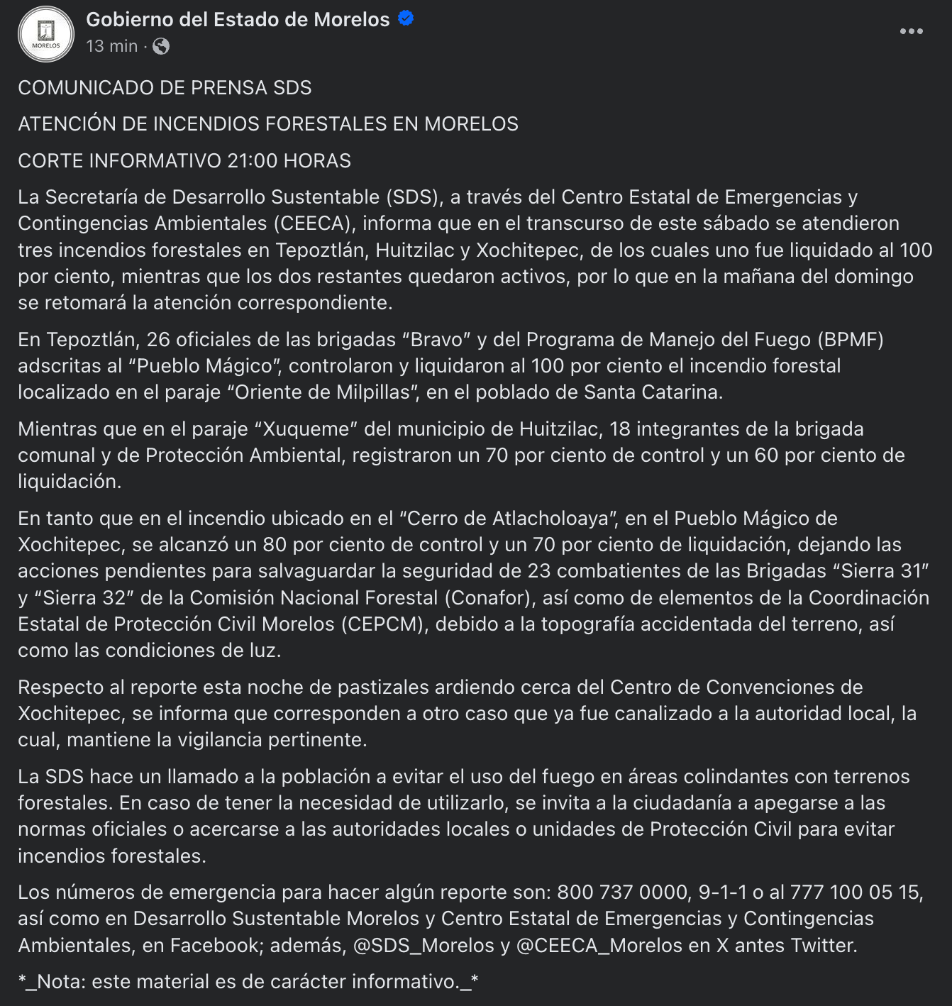 A través de un comunicado de prensa difundido hace unos minutos, el Gobierno del Estado de Morelos, a través de la Secretaría de Desarrollo Sustentable (SDS), en coordinación con el Centro Estatal de Emergencias y Contingencias Ambientales (CEECA), informaron que este sábado 9 de marzo, fueron atendidos tres incendios forestales en los municipios de Tepoztlán, Huitzilac y Xochitepec.