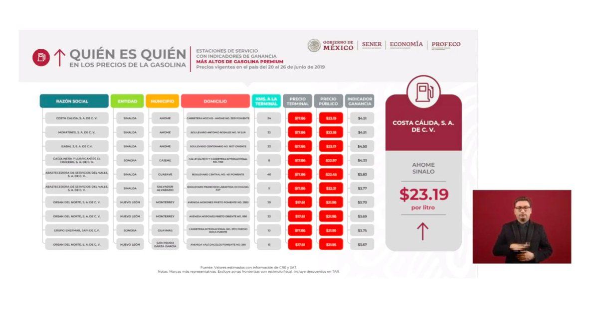 Durante la conferencia de prensa, el presidente estuvo acompañado por el titular de la Procuraduría Federal del Consumidor (Profeco), Ricardo Sheffield, quien de primera instancia presentó los precios de las gasolinas, diésel y gas LP, además de dar a conocer al pueblo mexicano la nueva app “Litro por Litro”.