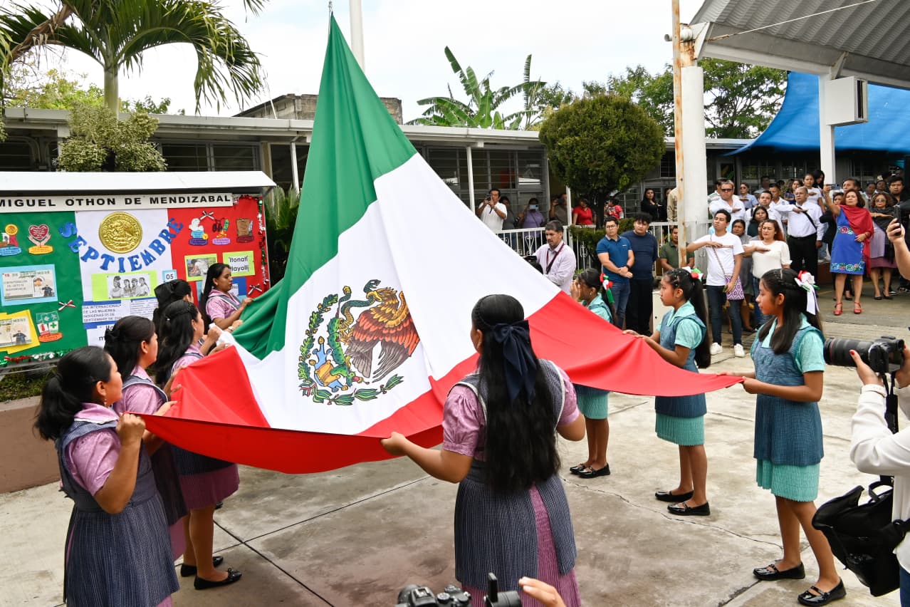 Durante la ceremonia, la gobernadora morelense, acompañada por autoridades de los tres órdenes de gobierno, encabezó los Honores a la Bandera, la cual estuvo izada a toda asta. Al mismo tiempo, el Himno Nacional y la Marcha Morelense fueron interpretados en lengua náhuatl por los estudiantes del plantel educativo.