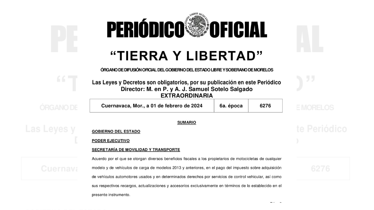 La Secretaría de Movilidad y Transporte del Gobierno del Estado (SMyT) publicó un acuerdo en el cual se otorgan beneficios fiscales a los propietarios de motocicletas de cualquier modelo, luego de que en el ejemplar 6276 del periódico oficial Tierra y Libertad.