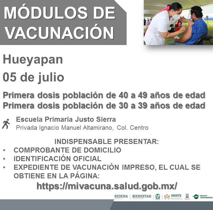 Axochiapan y Tepalcingo también tendrá jornada de vacunación los días 5 y 6 de julio, pero para estos municipios solo se aplicarán segundas dosis para la población de 40 a 49 años.