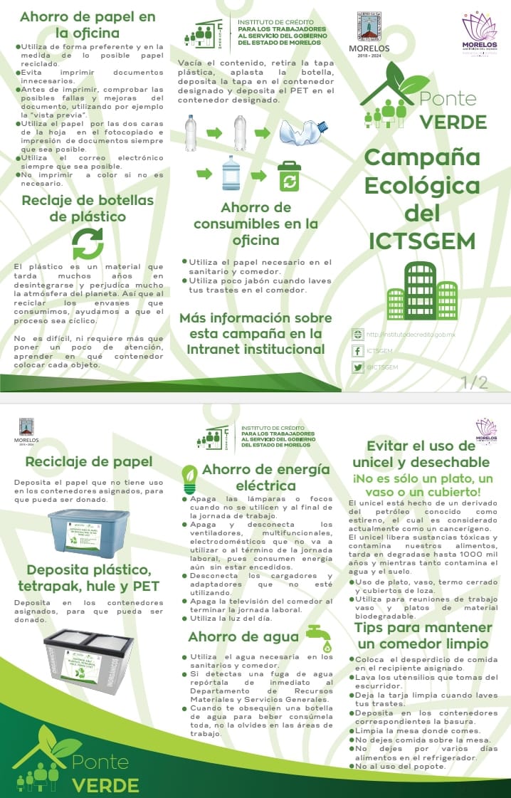 En el marco del Día Internacional del Medio Ambiente, el Instituto de Crédito para los Trabajadores al Servicio del Gobierno del Estado de Morelos (ICTSGEM) mantiene activa desde hace un año la estrategia ecológica que ha convertido a la institución en un organismo sustentable, esto aunado a la implementación de la Campaña “Ponte Verde” desde el año 2019.