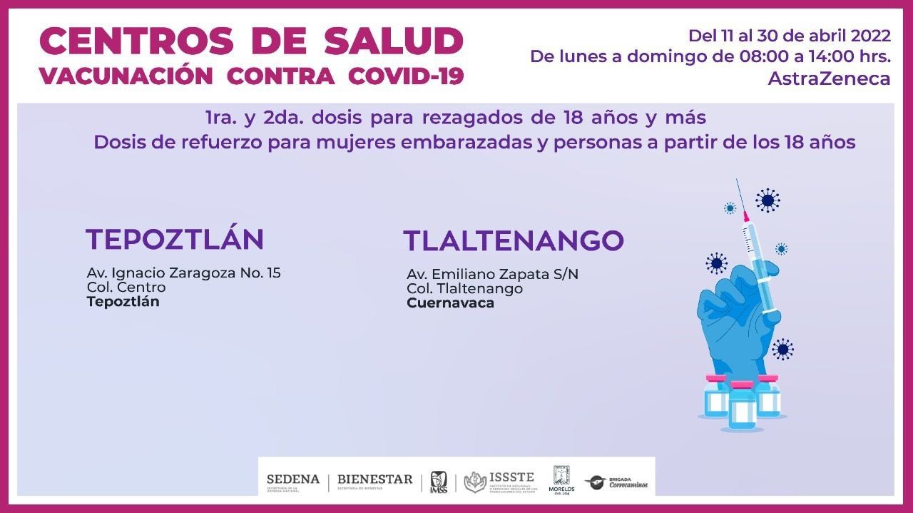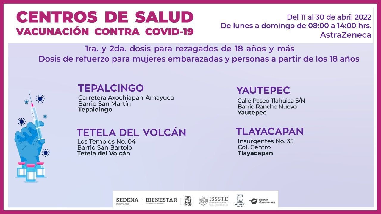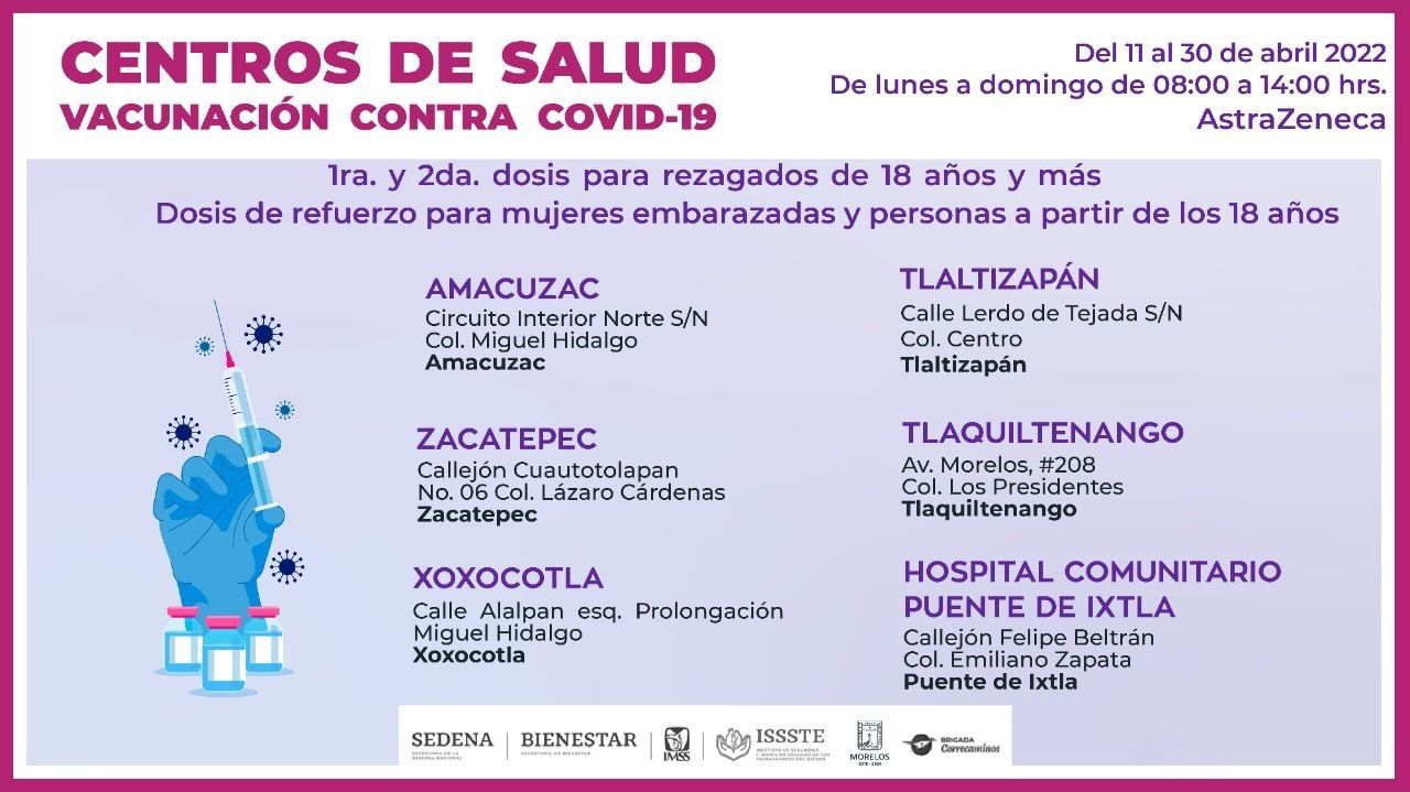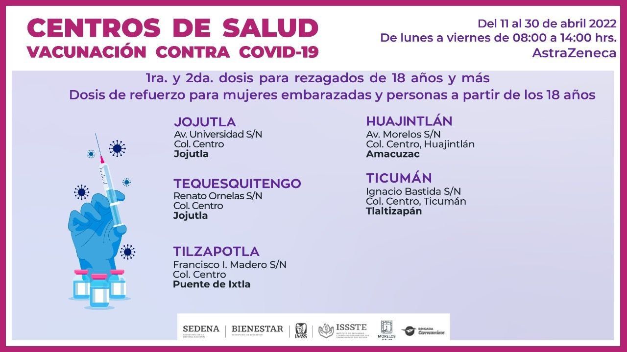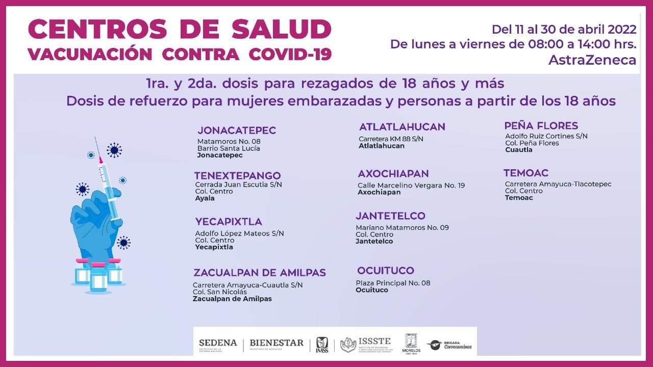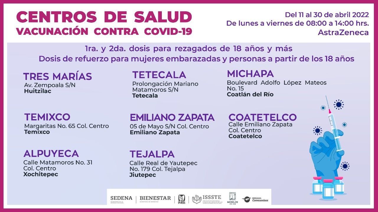 En seguimiento al Plan Nacional de Vacunación contra COVID-19 en Morelos, autoridades federales y estatales intensifican la cobertura de inmunización en los centros médicos de Servicios de Salud de Morelos (SSM), dentro del periodo del 11 al 30 de abril del 2022.