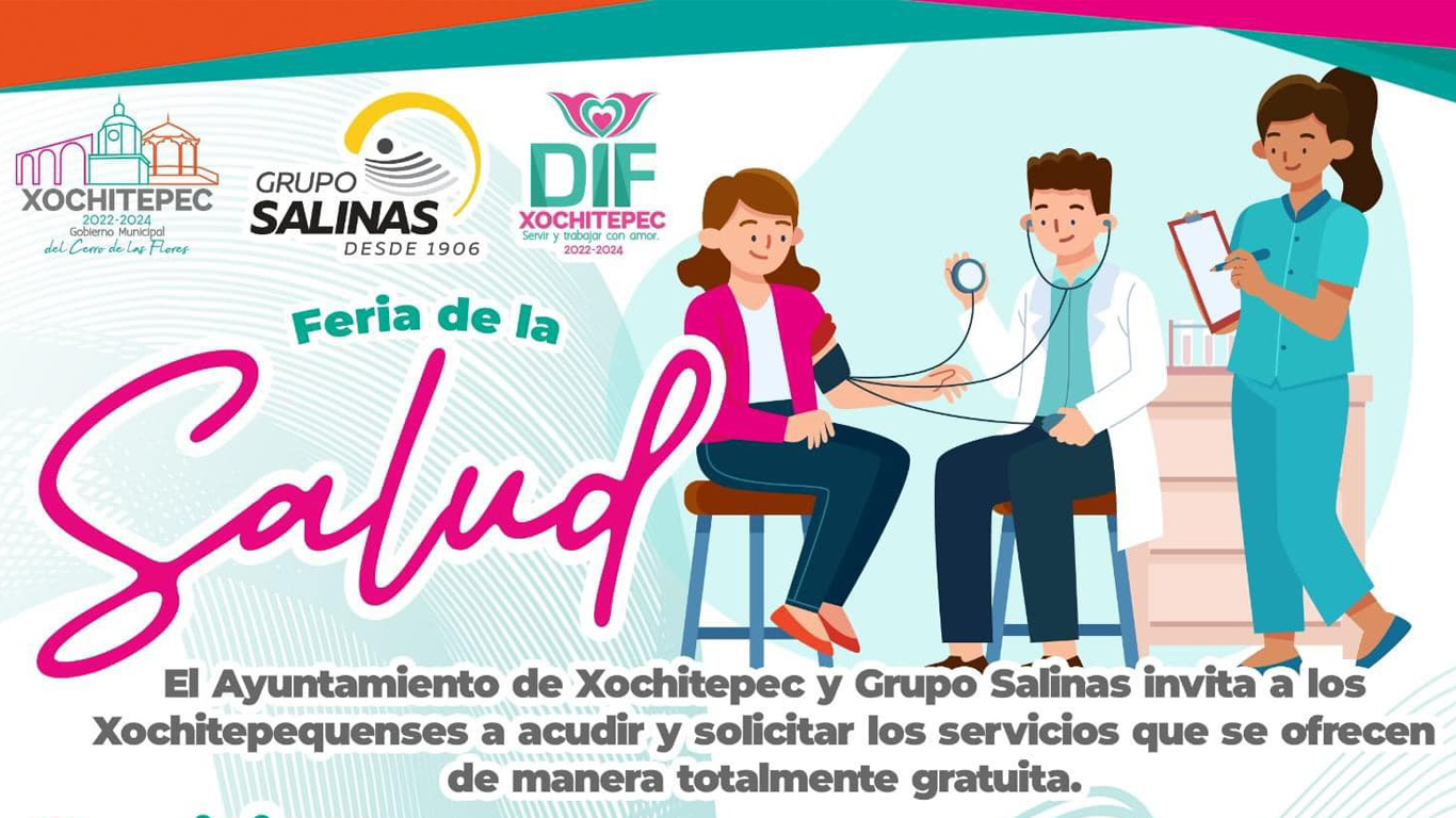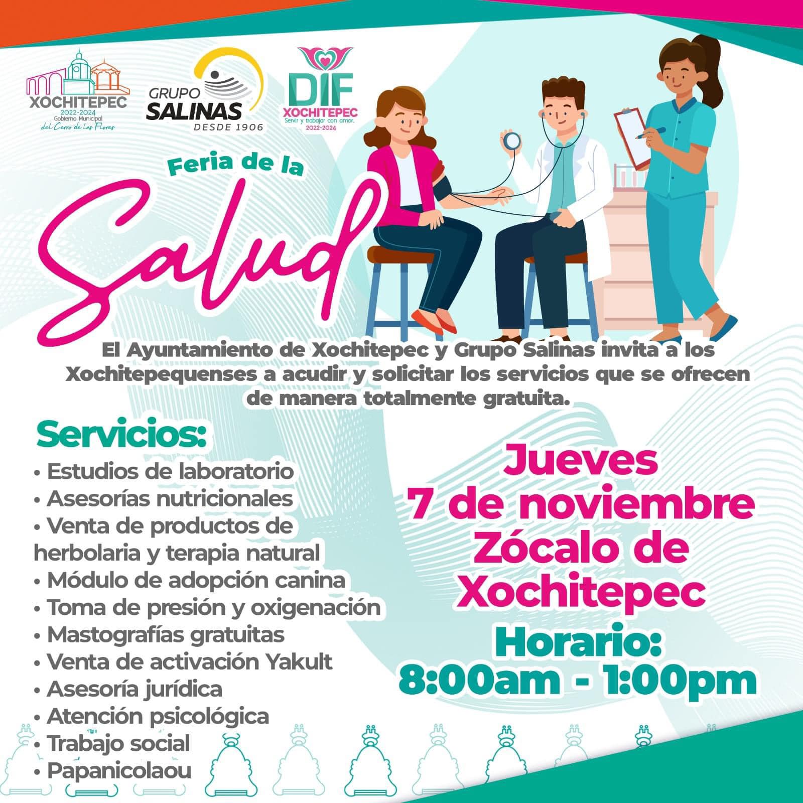 El H. Ayuntamiento de Xochitepec y Grupo Salinas invitan a la comunidad a asistir a la Feria de la Salud, que se llevará a cabo este jueves 7 de noviembre.