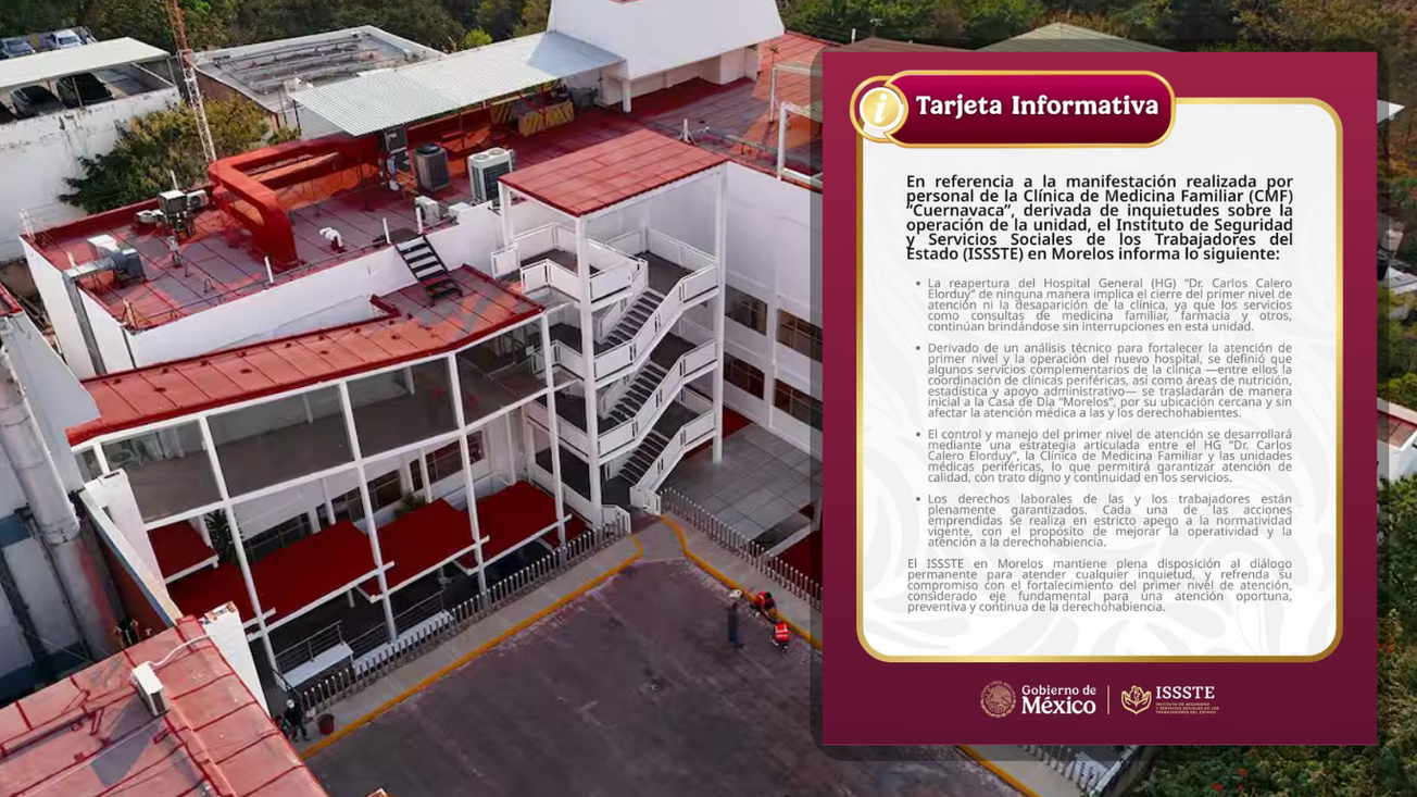 El Instituto de Seguridad y Servicios Sociales de los Trabajadores del Estado (Issste) informó las acciones emprendidas tras las inconformidades manifestadas por personal de la Clínica de Medicina Familiar “Cuernavaca”, relacionadas con la operación de la unidad.