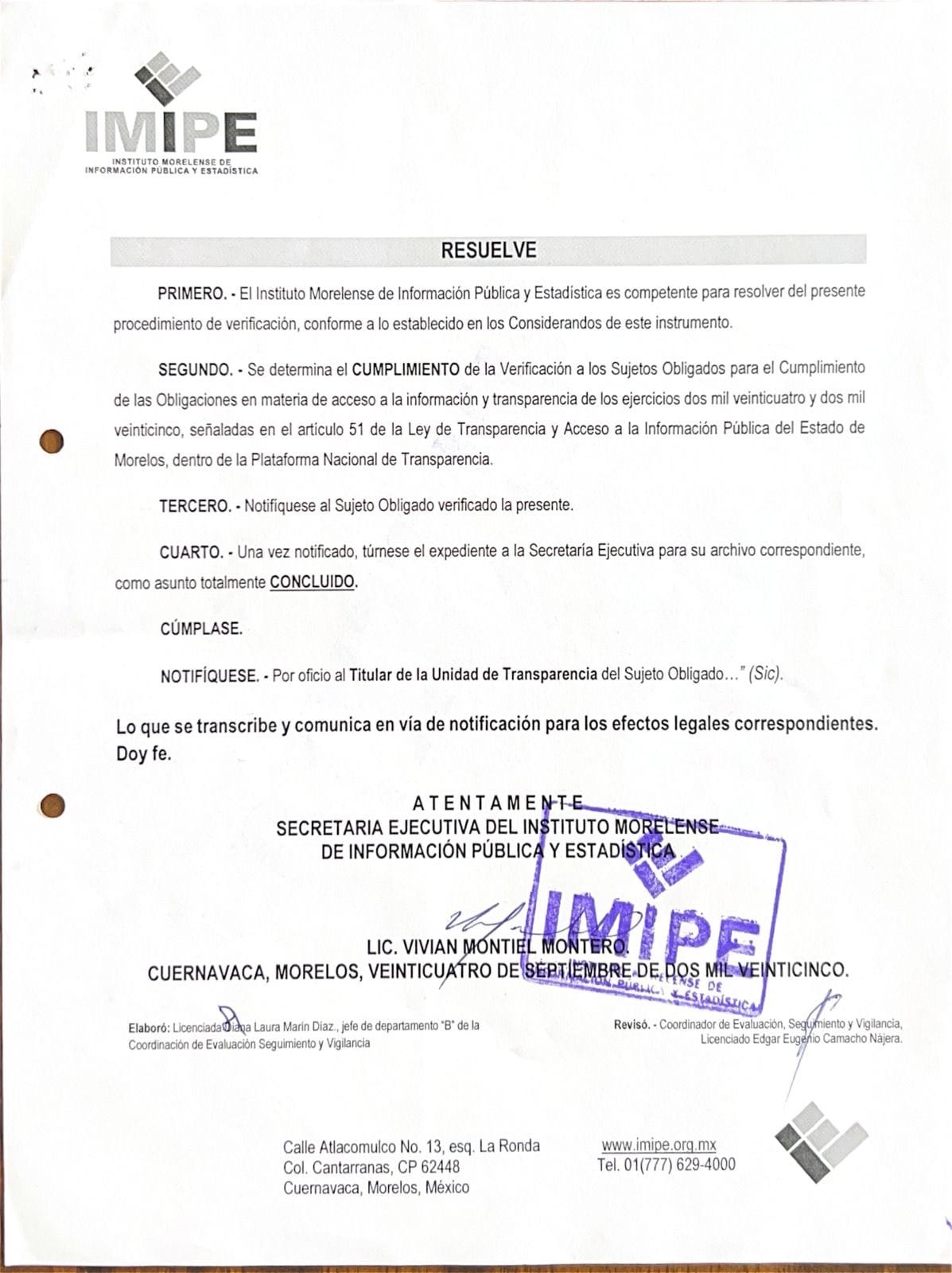 El Instituto Morelense de la Información Pública y Estadística (IMIPE) realizó una verificación detallada para evaluar el cumplimiento de estas obligaciones, confirmando que toda la información requerida se encuentra publicada, completa y actualizada en la Plataforma Nacional de Transparencia (PNT).