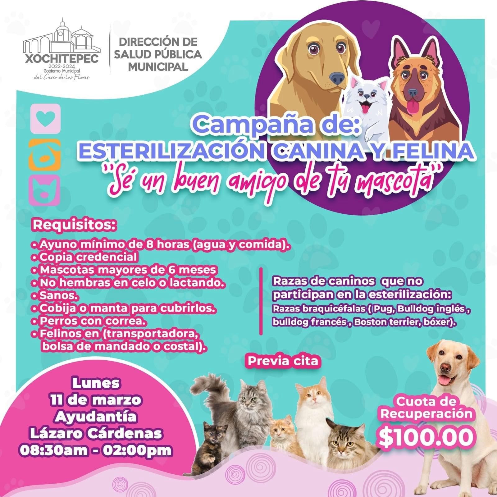 El ayuntamiento de Xochitepec invitó a la población a participar en la ”Campaña de Esterilización canina y felina” éste lunes 11 de marzo en la colonia Lázaro Cárdenas en un horario de 8:30 de la mañana a 2 de la tarde.