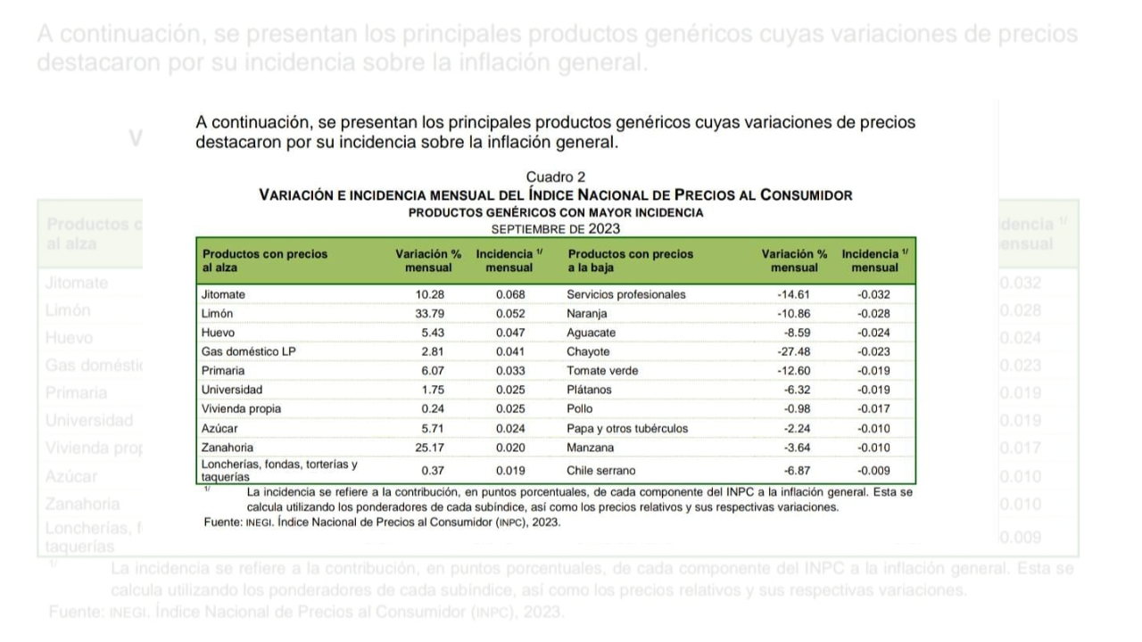 En septiembre de 2023, el INPC registró que la inflación general anual fue de 4.45%, en comparación con el mismo mes, pero del 2022 la inflación mensual fue de 8.70 %.
