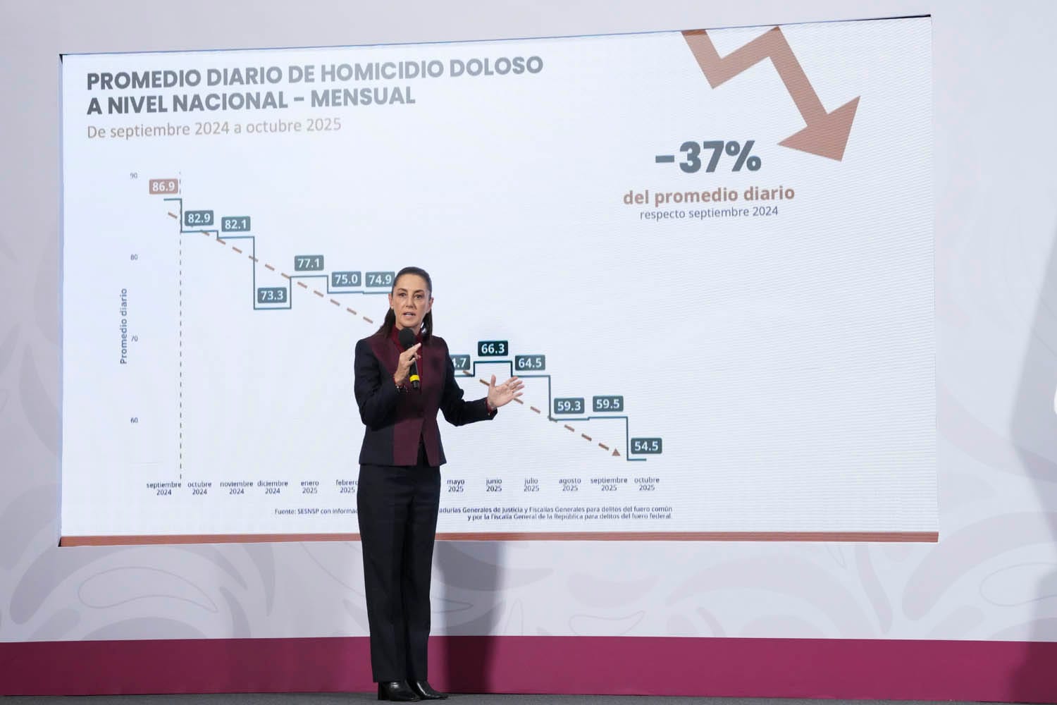 Asimismo, Sheinbaum informó que, de octubre de 2024 a octubre de 2025, su administración ha logrado disminuir los homicidios dolosos en un 37%, resultado de la estrategia integral de la 4T, basada en atender las causas sociales de la violencia y garantizar la no impunidad para los generadores de violencia en el país.