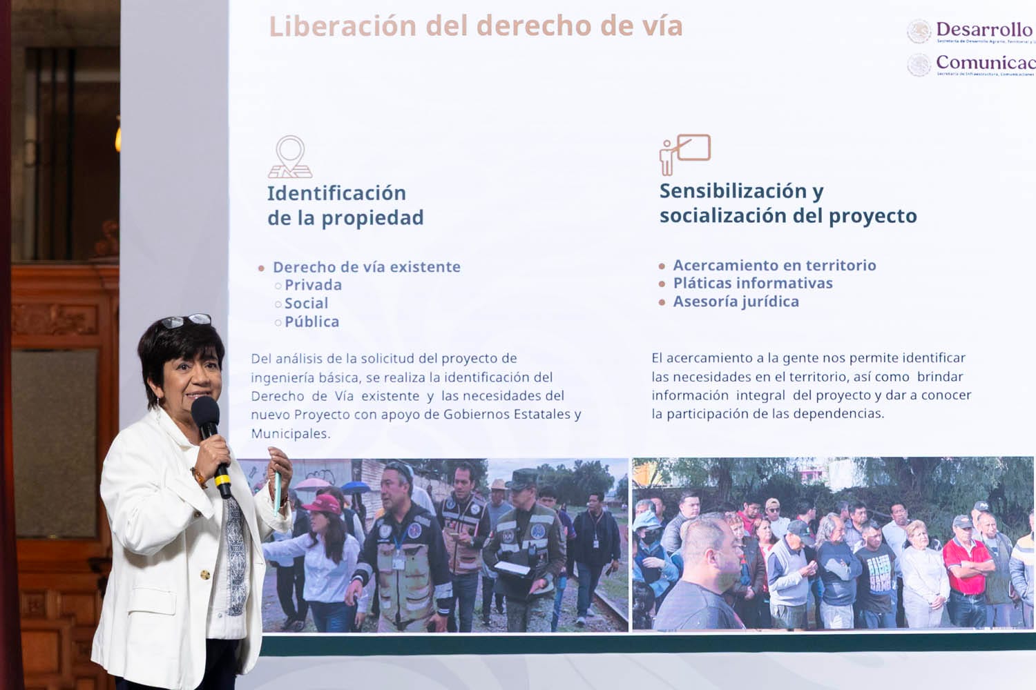 En la Conferencia del Pueblo, la secretaria de Desarrollo Agrario, Territorial y Urbano, Edna Elena Vega, informó sobre las labores del Gobierno Federal para garantizar la liberación de derechos de vía en la construcción de líneas ferroviarias. Explicó que, en coordinación con la SCyT y la SEDATU, se identificó un derecho de vía histórico que facilita el avance de los proyectos de trenes de pasajeros en el país.