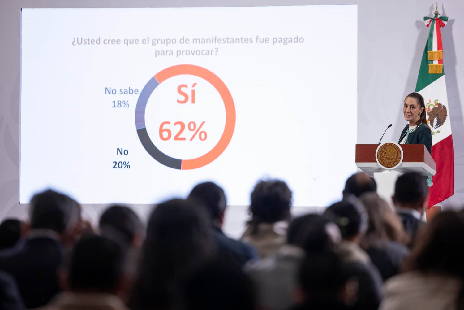 La presidenta Claudia Sheinbaum Pardo se pronunció ante una reciente encuesta, en la cual, según la ciudadanía entrevistada, la reciente marcha de la Generación Z fue orquestada por miembros de la derecha política, tanto nacional como internacional. La mandataria remarcó que no se está en contra de una manifestación legitima; sin embargo, aseguró que no se tolerarán agresiones y actividades delictivas encubiertas bajo una manifestación, haciendo referencia a las agresiones y saqueos registrados en las protestas por el llamado "bloque negro".