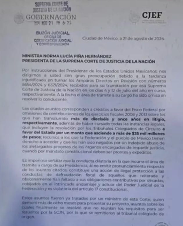 Durante la mañanera, López Obrador mostró la carta que envió a la Ministra Presidenta de la la Suprema Corte de Justicia de la Nación (SCJN), en la que relatan dos casos de créditos a favor del Fisco federal por supuestas omisiones de contribuciones en los ejercicios fiscales 2008 y 2013.