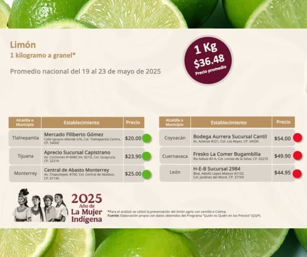 De acuerdo con información de la Procuraduría Federal del Consumidor, Fresko La Comer tiene una tache por vender en casi 50 pesos el kilo del limón, cuando el precio promedio es de $36.48 pesos.
