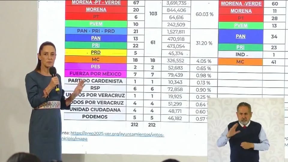 El pasado domingo, se llevaron a cabo elecciones para presidencias municipales, regidurías y sindicaturas en Durango, Veracruz y Puebla. Tras ello, este martes, la Presidenta Claudia Sheinbaum, hizo mención de los resultados electorales de Veracruz y Durango, comparando los de 2012 con los de 2025.