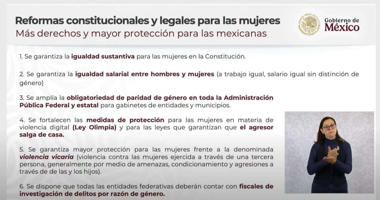 La Presidenta de México, Claudia Sheinbaum Pardo, anunció sobre las modificaciones en la Constitución; además existirá una cartilla de mujeres y la pensión para el Bienestar de las Mujeres Adultas Mayores será repartida en enero de 2025.