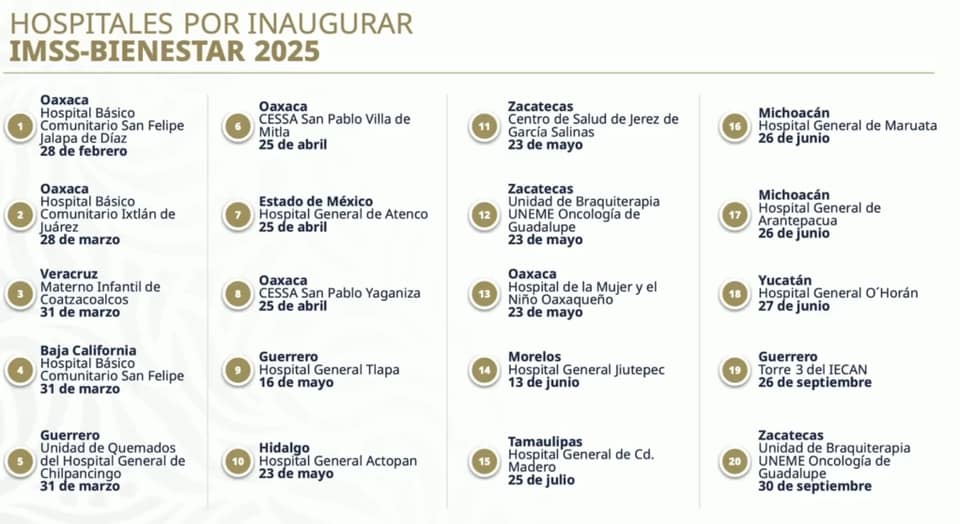 El Gobierno de México tiene la meta de aperturar 20 hospitales del IMSS-Bienestar, en donde destaca el de Jiutepec, Morelos; que se tiene previsto sea inaugurado el 13 de junio del presente año.