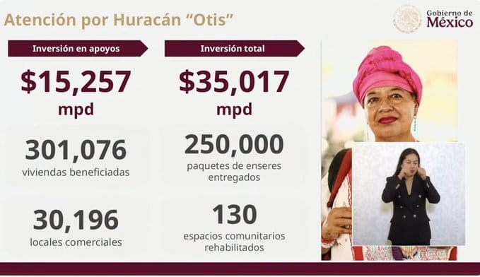 El Gobierno de México reportó que hubo una inversión en apoyos de 35 mil mdp para beneficiar a más de 300 mil familias, tras el huracán 'Otis' en Acapulco; así lo informó Carlos Torres Rosas, secretario técnico del Gabinete de la Presidencia y Coordinador General de Programas para el Bienestar.