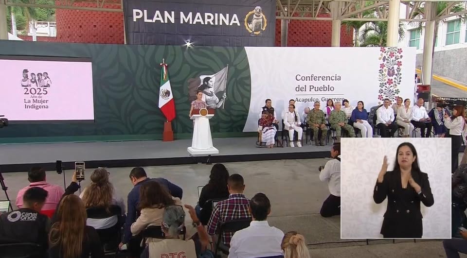 Claudia Sheinbaum Pardo inicia la ‘Mañanera del Pueblo’ desde Acapulco, Guerrero, acompañada por parte de su gabinete y autoridades del Estado.