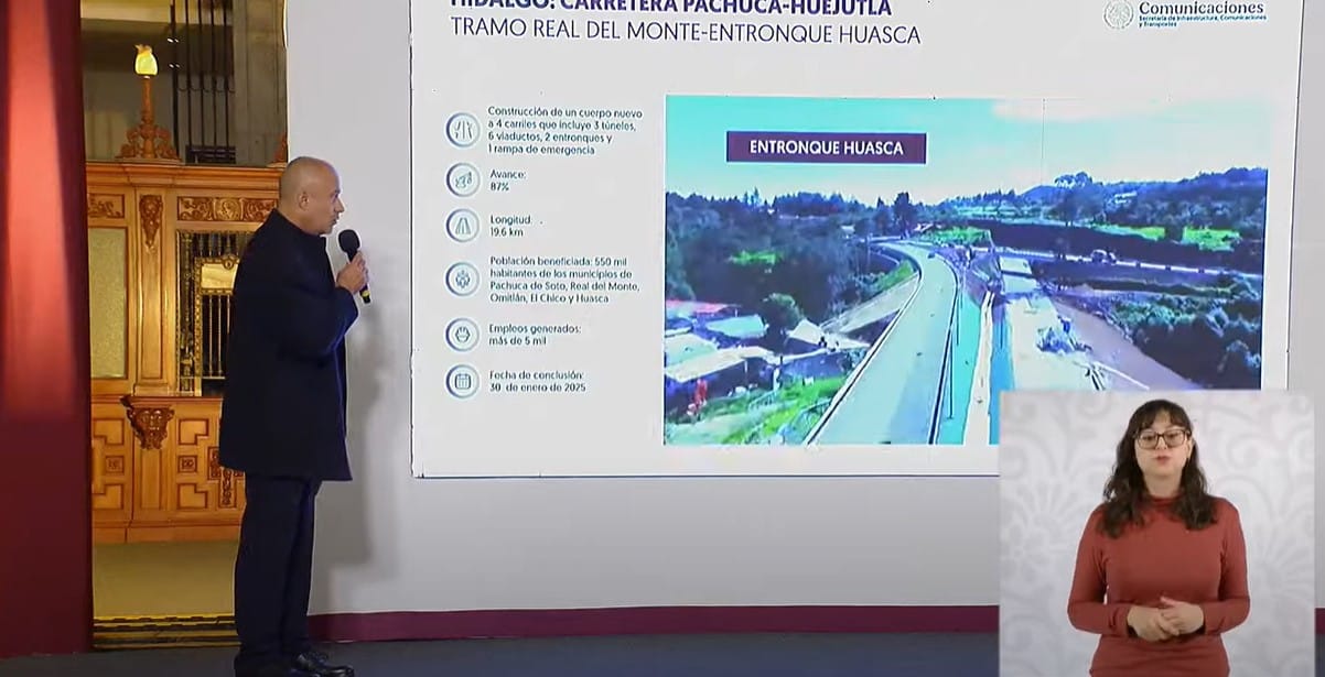 El Tramo Real del Monte - Entronque Huasca, cuenta con 87% de avance y se concluirá el 30 de enero de 2025.