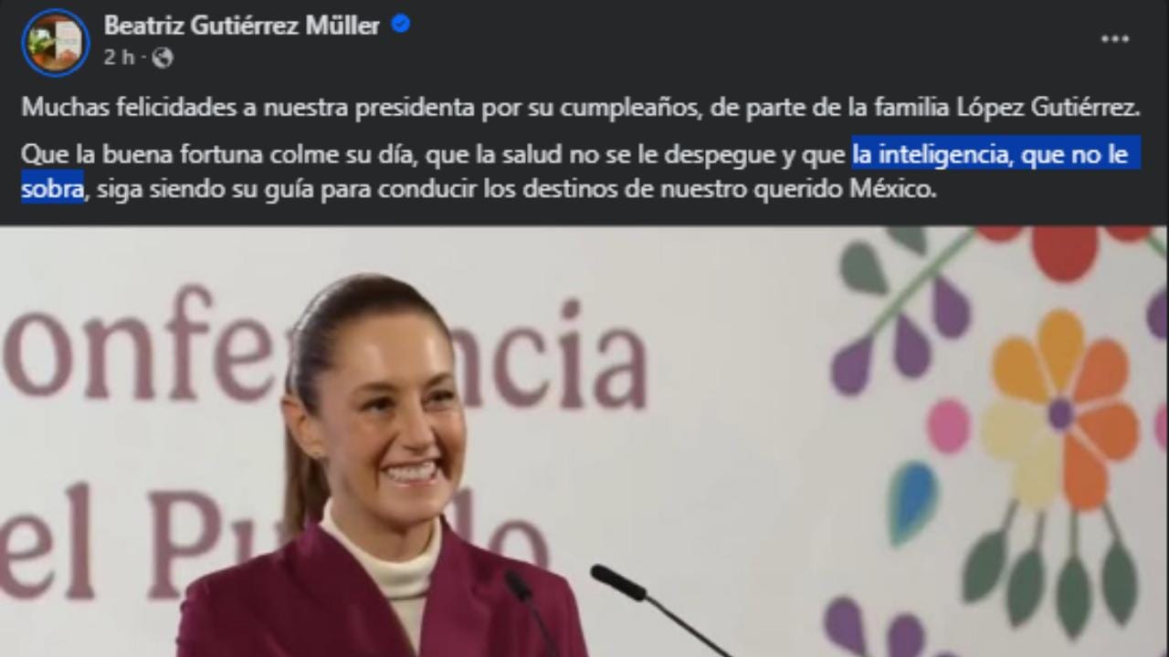 Luego que Beatriz Gutiérrez Müller, esposa del expresidente Andrés Manuel López Obrador, la felicitó a través de Facebook con motivo de su cumpleaños, pero se vio envuelta en polémica por su mensaje, la presidenta Sheinbaum Pardo agradeció la felicitación y aseguró que es una mujer inteligente y muy culta.