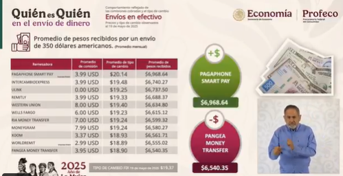 En una simulación por $350 dólares americanos, con base en las comisiones y tipo de cambio al 19 de mayo, la que más da en envíos en efectivo es Pagaphone Smart Pay, con $6,968.64 pesos; en contraste, la que menos entrega es Pangea Money Transfer, con $6,540.35 pesos.