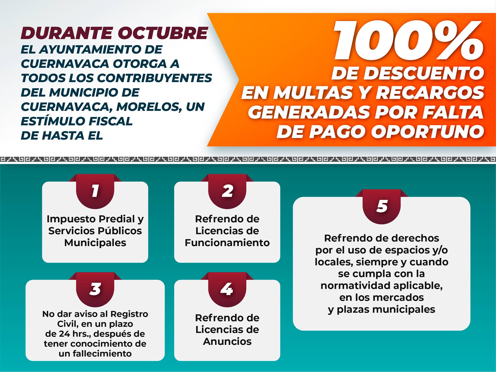 El Ayuntamiento de Cuernavaca junto con la Tesorería Municipal han decidido otorgar 50 % de descuento en multas e infracciones viales expedidas desde el 2016 al 2021. Ya sea para autos locales o foráneos.