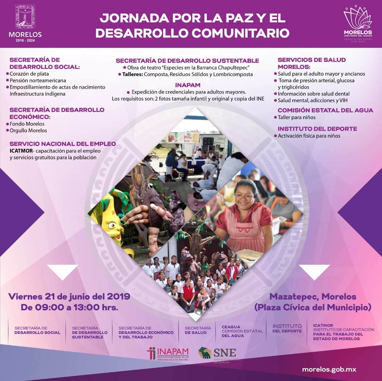 Servicios de salud, capacitación de empleo, talleres ambientales, activación física para niños, una obra de teatro y más, es lo que disfrutarás en la sexta edición de la Jornada por la Paz y Desarrollo Comunitario que se llevará a cabo el próximo 21 de junio en la Plaza Cívica de Mazatepec en un horario de 9:00 a 13:00 horas.