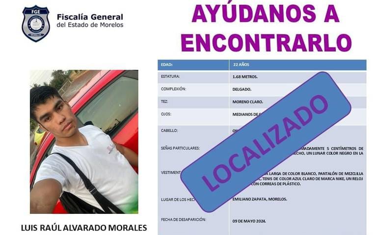 La Fiscalía General del Estado de Morelos informó sobre la localización con bien del joven boxeador morelense Luis Raúl Alvarado Morales, quién fue reportado como desparecido en Morelos el pasado 09 de mayo.