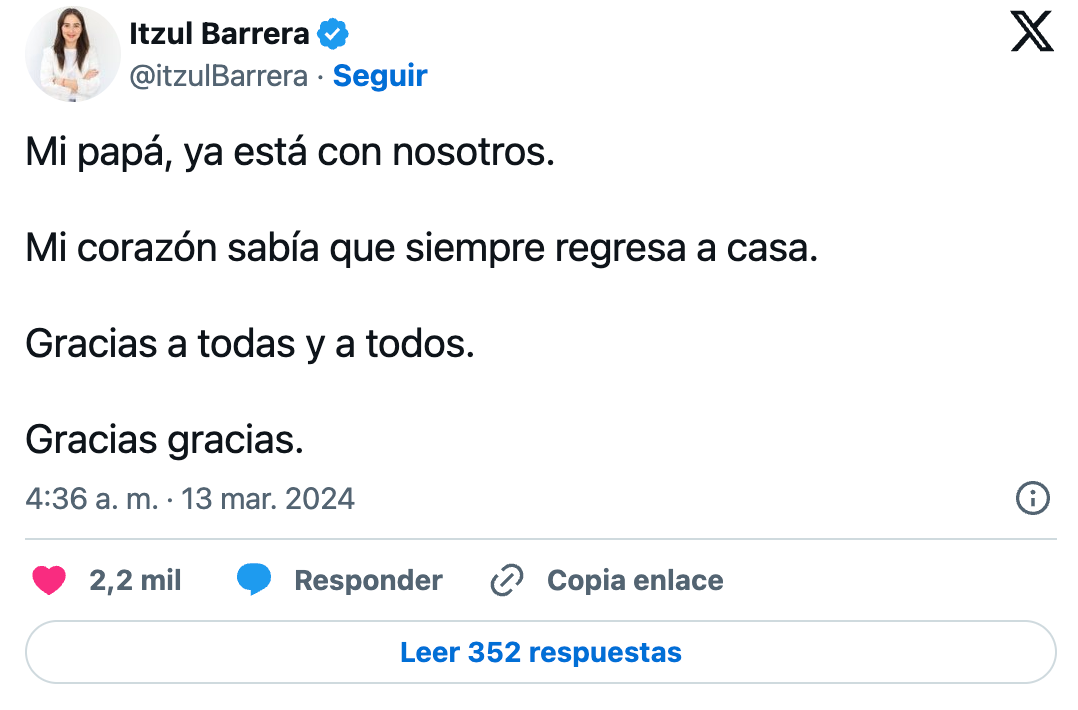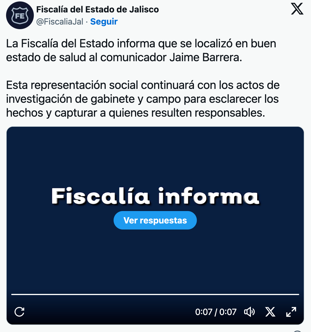 Alrededor de las 4:40 de la madrugada de este miércoles, Itzul Barrera, hija del comunicador Jaime Barrera, anunció su localización con vida; una hora después, a las 5:37 de la mañana, la Fiscalía General del Estado de Jalisco, confirmó la información a través de sus redes sociales, asegurando que se encuentra con buen estado de salud.