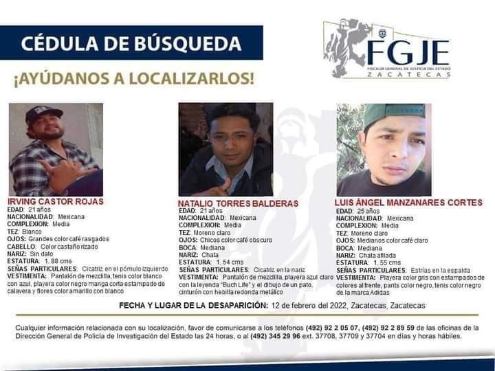 Los hechos de violencia continúan en la entidad zacatecana, y es que a través de un comunicado la Fiscalía General del Estado informó sobre la localización sin vida de 4 de 5 jóvenes universitarios de entre 21 y 25 años, quienes fueron privados de su libertad la madrugada del sabado 12 de febrero, cuando salían de un centro nocturno en la capital.