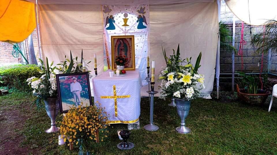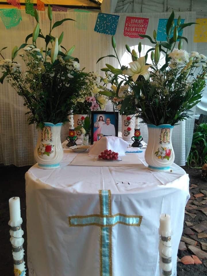 La mesa mencionada está cubierta por un mantel negro o blanco, con una cruz al frente que hace referencia al cuerpo de la persona difunta. Al centro, la fotografía de la misma y una imagen religiosa.