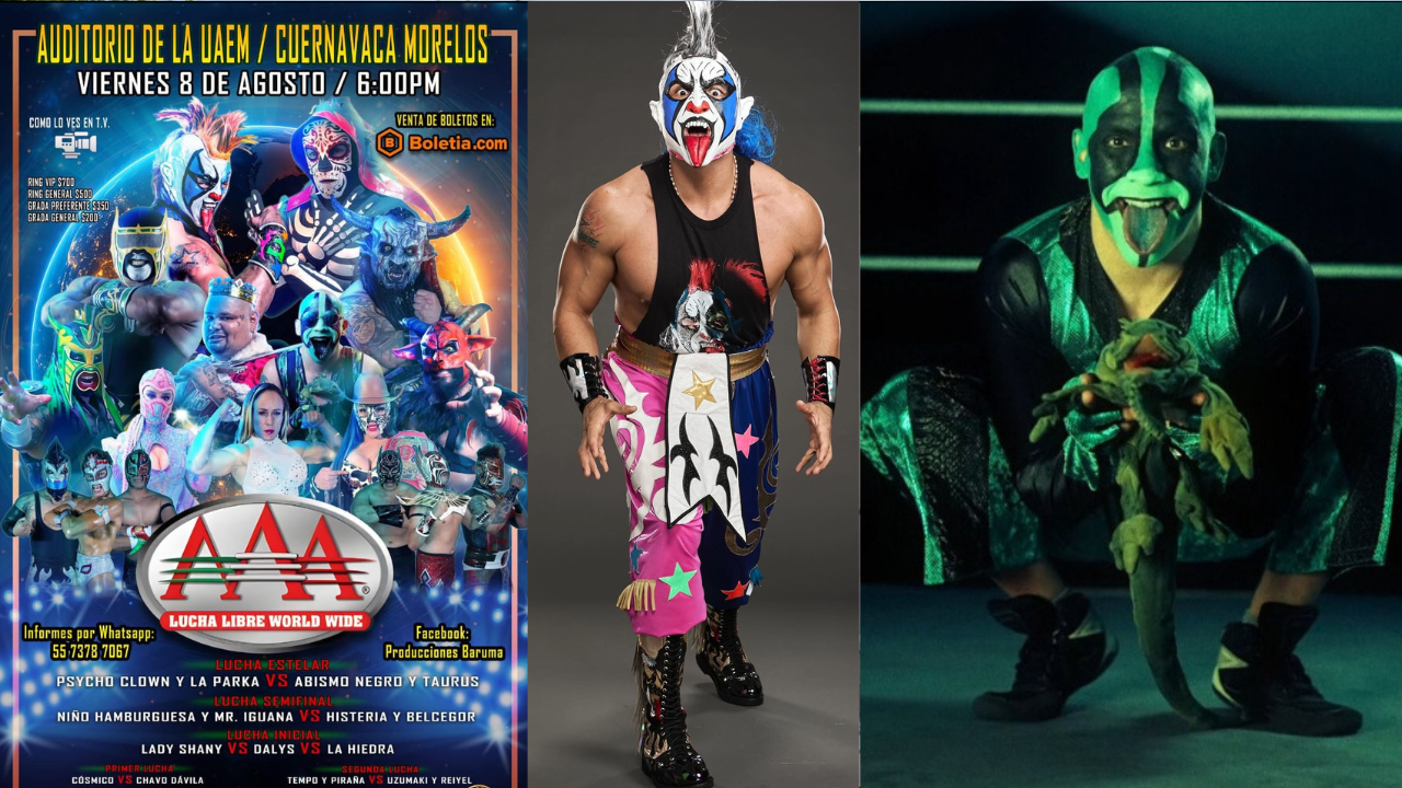 La función será este próximo viernes 08 de agosto en el Auditorio de la Universidad Autónoma del Estado de Morelos (UAEM). La lucha estelar está a cargo de justamente el Polémico del Momento Abismo Negro, con Taurus VS La Parka y la potencia mundial de la lucha libre Psycho Clown, quien viene de estar presente en carteles de la WWE.