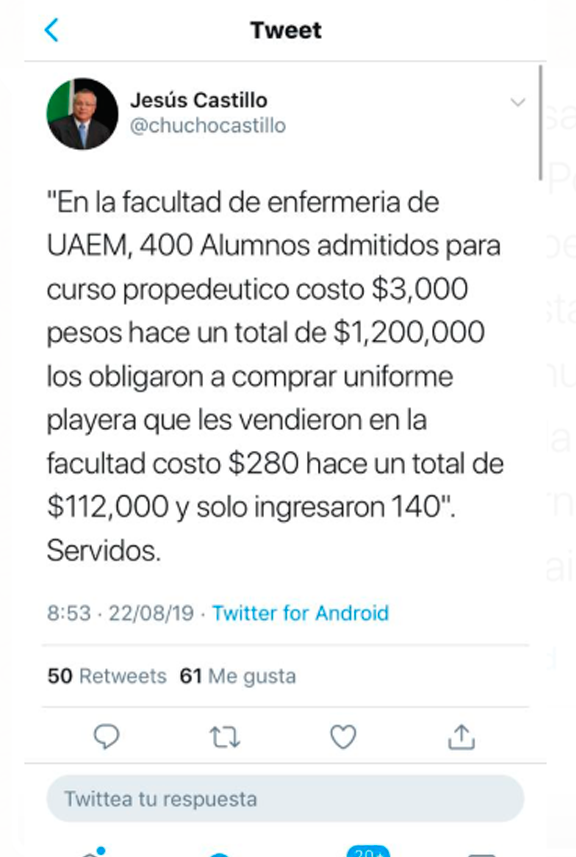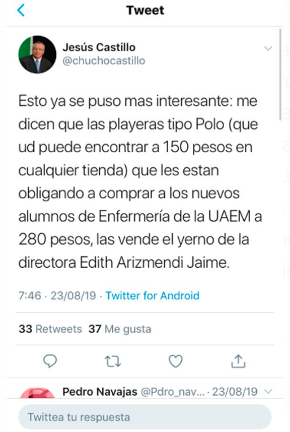 Pero no es la única arbitrariedad, el columnista @chuchocastillo reveló, a través de sus redes sociales que esta misma funcionaria habría obligado a los estudiantes a comprar uniformes en la empresa de uno de sus familiares. Las prendas fueron vendidas en un precio de 280 pesos, cuando su valor comercial es tan solo de 150 pesos.