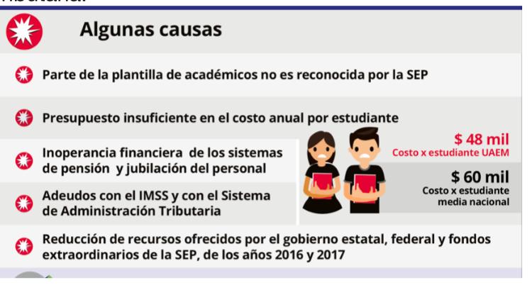 A pesar del cambio de rectoría y un plan de austeridad anunciado por el actual Rector Gustavo Urquiza, el panorama financiero de la UAEM no parece tener una pronta solución. Y es que a pesar de las aportaciones de recursos públicos la Universidad no ha logrado sanar sus finanzas, entre algunas causas destacan, contar con parte de la plantilla de académicos sin reconocimiento por parte de la SEP, inoperancia financiera de los sistemas de pensión y jubilación del personal, adeudos con el IMSS y con el Sistema de Administración Tributaria.