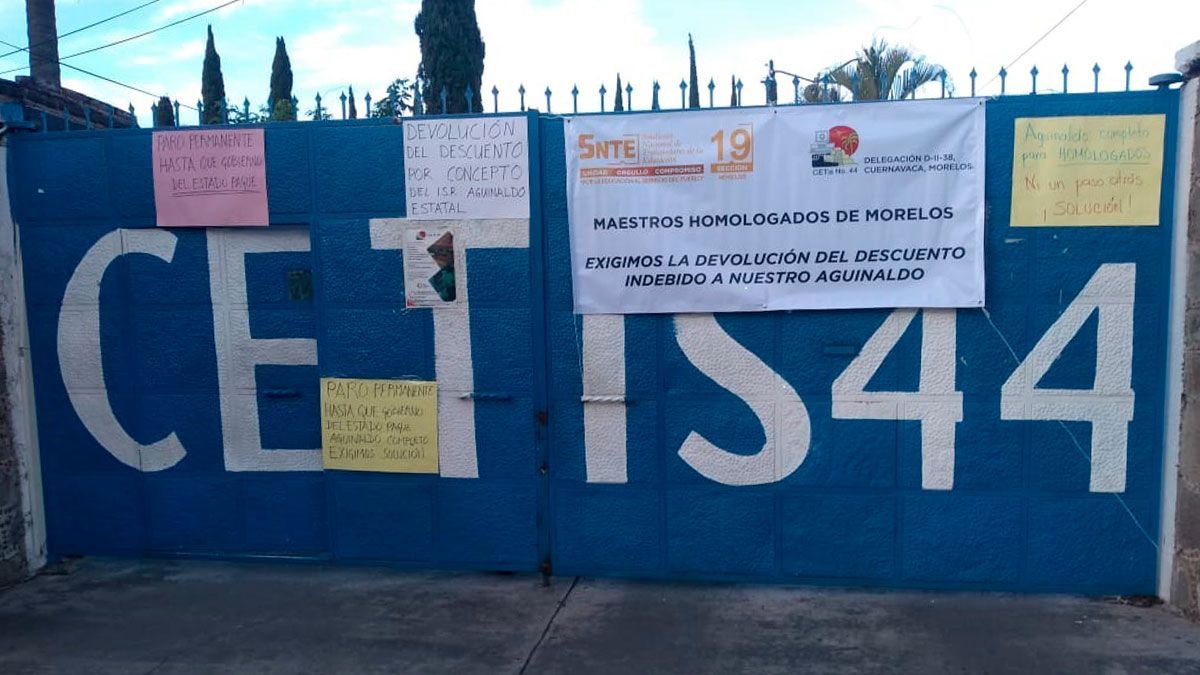 Este viernes maestros homologados del Cetis, Cbtis y otros subsistemas, iniciaron un paro de labores indefinido para exigir a las autoridades el pago de su aguinaldo 2019 y la devolución del impuesto de ISR aplicado a esa bonificación.
