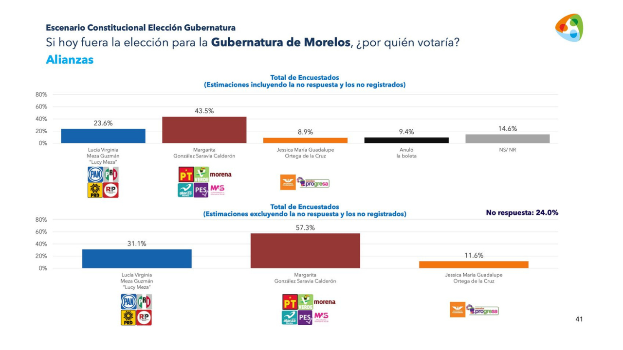 El ejercicio demoscópico revela que por coaliciones, González Saravia cuenta con intención de voto de 33.6% de Morena, 4.1 del PVEM y 3.5 del PT, dando un total de 41.2 por ciento.