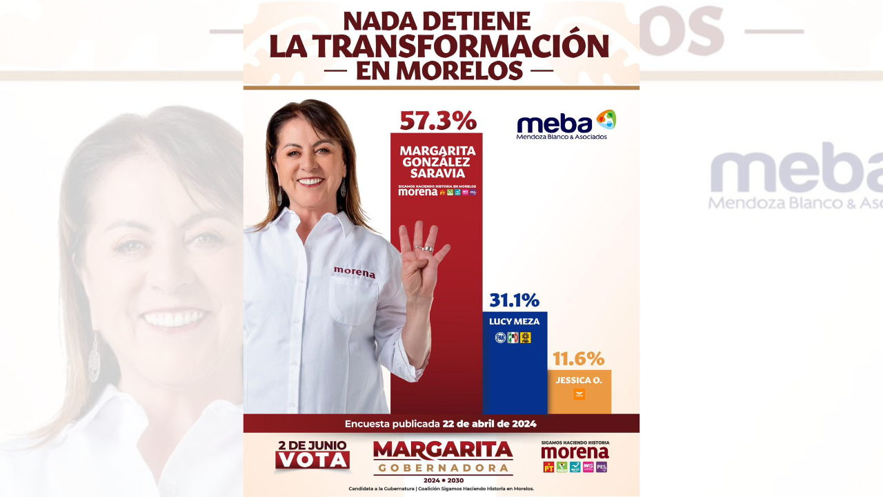 La candidata de la coalición Morena, PT y PVEM a la gubernatura de Morelos, Margarita González Saravia mantiene una ventaja superior a los 20 puntos porcentuales respecto a su más cercana seguidora, Lucía Meza.