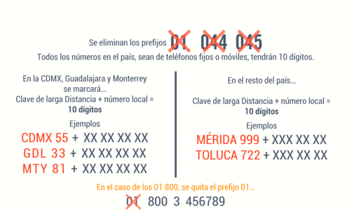 Para las llamadas a números celulares, se eliminarán los prefijos 044 y 045, y también se marcarán a 10 dígitos, no importando si el enlace se hace desde un número fijo o móvil en cualquier parte del país.