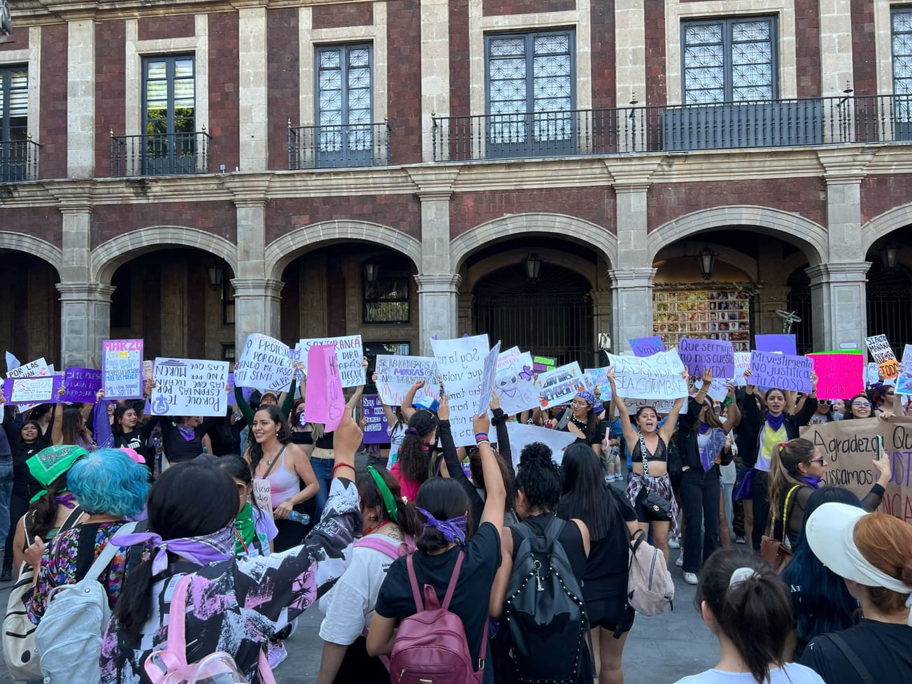 Vestidas con prendas color negro y pañuelos morados bajaron a calle Leyva en donde realizaron pintas en el edificio del Poder Judicial de la Federación; subieron en calle Gutemberg para llegar al zócalo de la ciudad. Antes, en las calles afuera de restaurantes ciudadanos mostraron solidaridad por el movimiento y ofrecieron aguas y refrescos a las participantes.