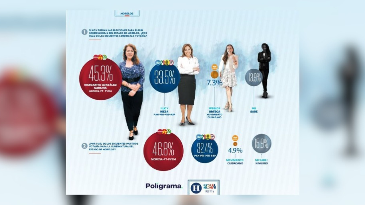 A la pregunta “Si hoy fueran las elecciones para elegir gobernadora del estado de Morelos, ¿por cuál de las siguientes candidatas votaría?”, 45.3 por ciento de los encuestados respondió que lo haría por Margarita González Saravia, candidata de Morena-PT-PVEM.