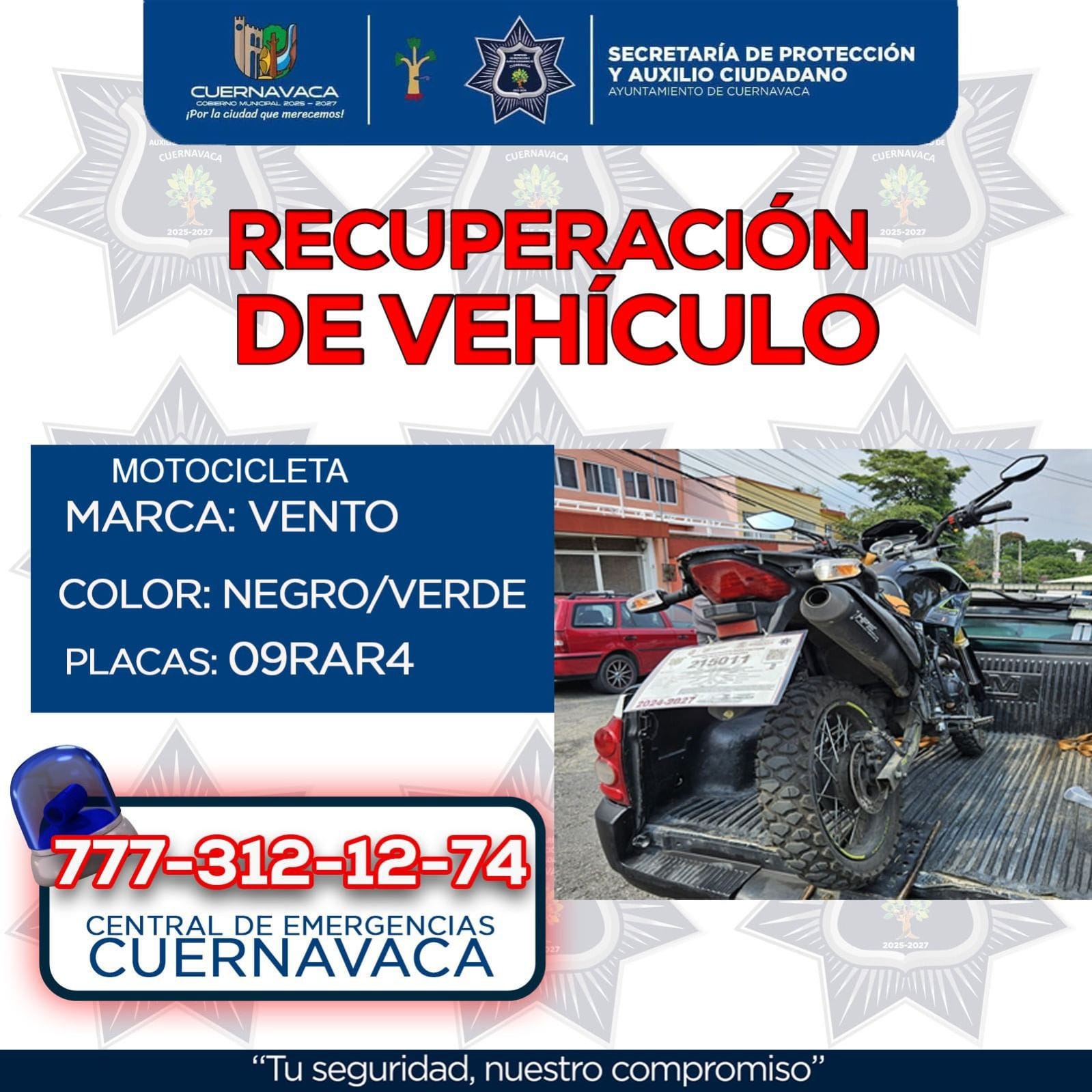 • La recuperación de dos vehículos con reporte de robo; una motocicleta marca Vento año 2021 con número de serie LB7VBGBD4M1005926 y un carro Chevrolet con palmas PVD589E del estado de Morelos.