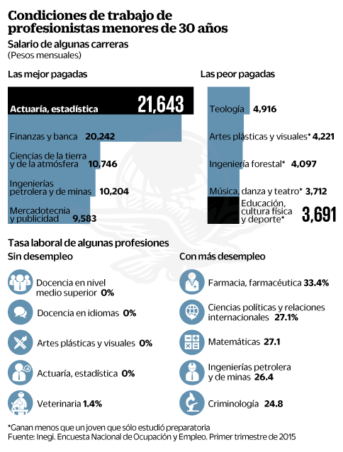 El análisis se basa en los datos de la Encuesta Nacional de Ocupación y Empleo (ENOE) que publica el Inegi y se enfoca exclusivamente en la población menor de 30 años con educación superior. Las cifras corresponden al primer trimestre de 2015.